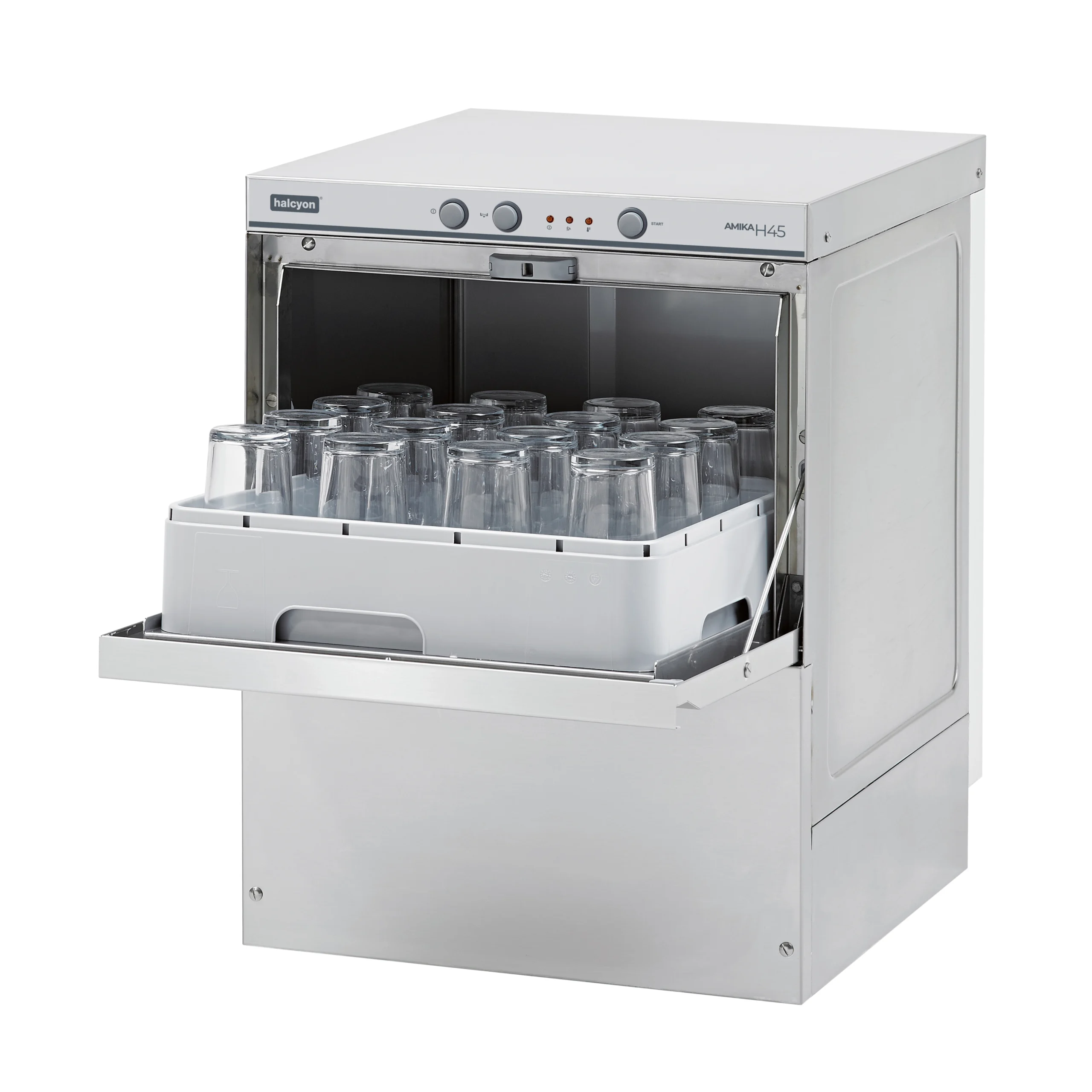 Simple easy to use controls and surface scrap trays supplied as standard. The Halcyon Amika AMH45 glasswasher is a great entry level commercial glasswasher, ideal for pub’s and bars.